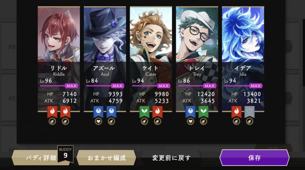 前回フロイドを編成メンバーに入れていたのですが、起用場面がほとんどなかったので、寮服アズールと寮服トレイのHP UPのバディであるイデアを入れることにしました。
