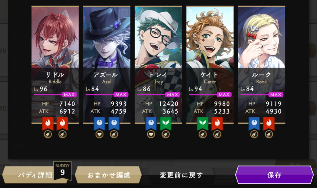 これらの編成で8割ぐらいクリアして、あとは属性を見ながら編成を組んでクリアしていきました。